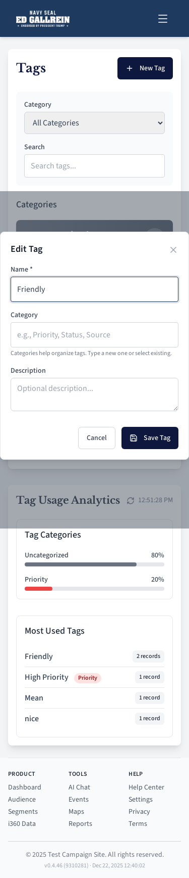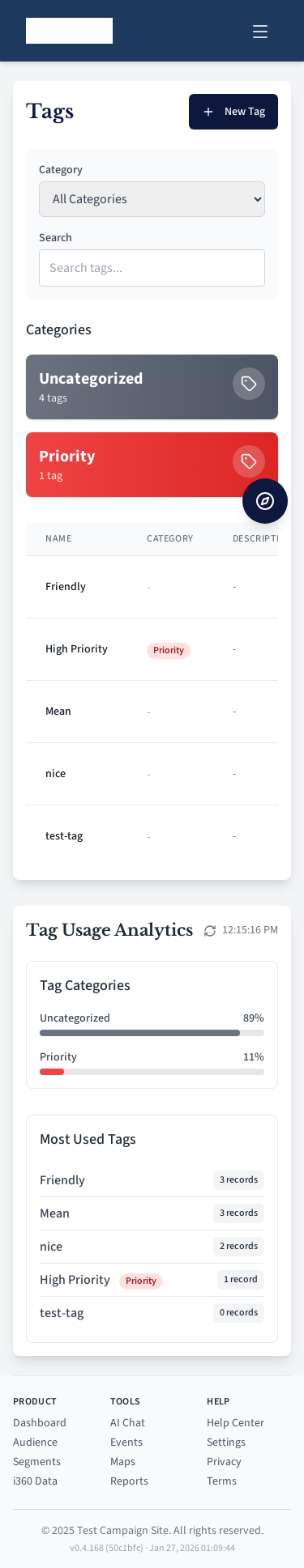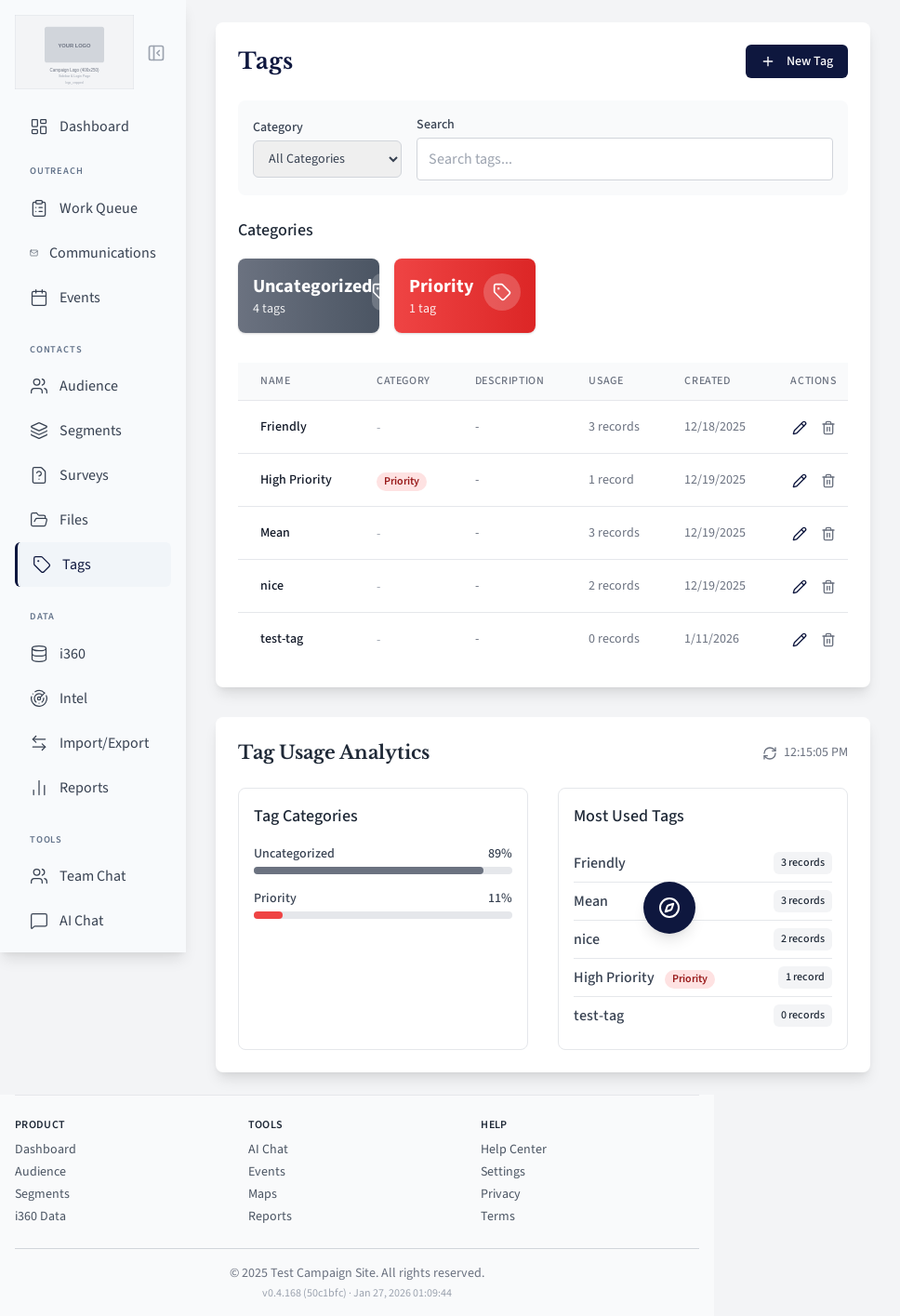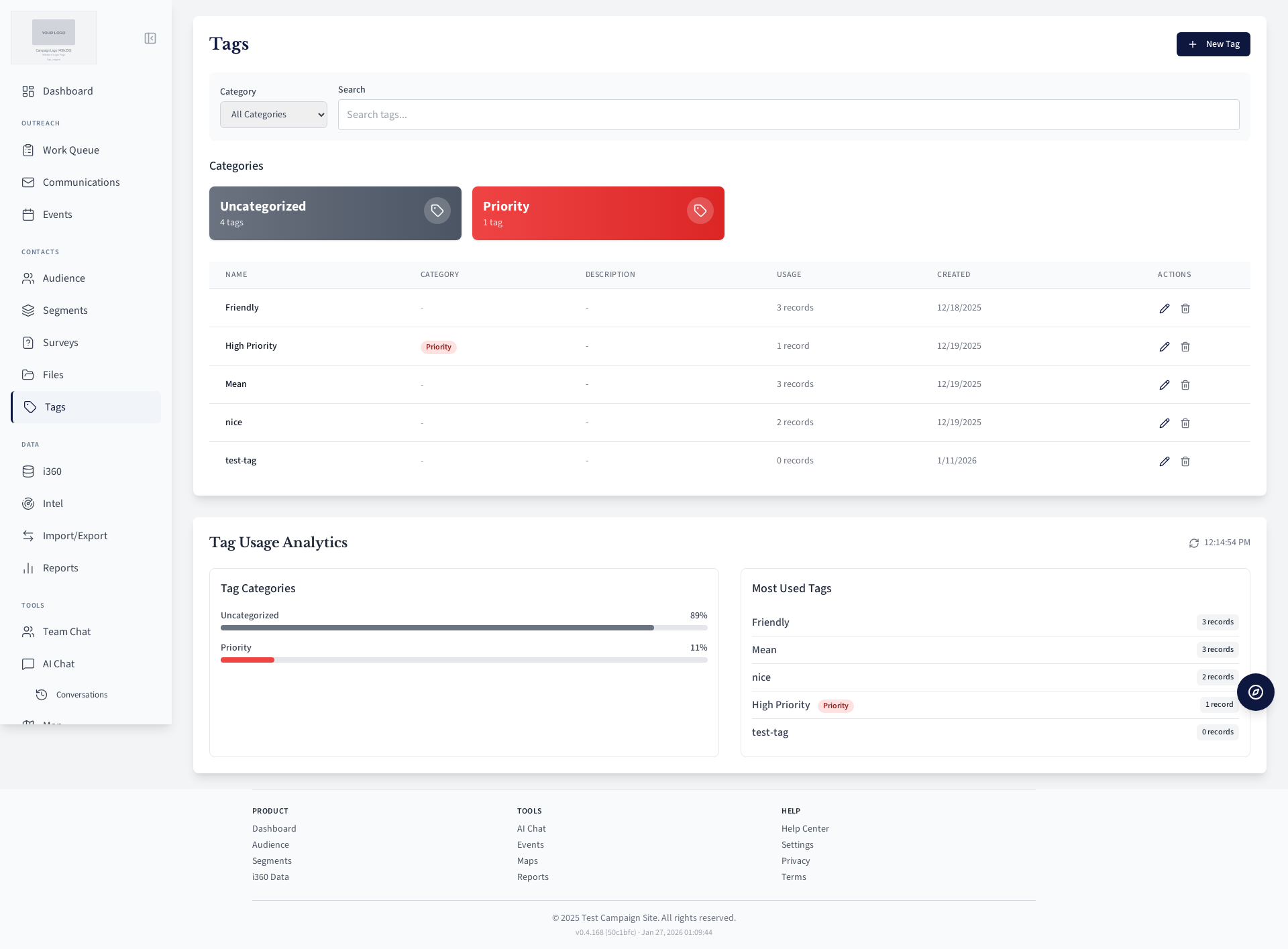 Tag management page for categorizing contacts.