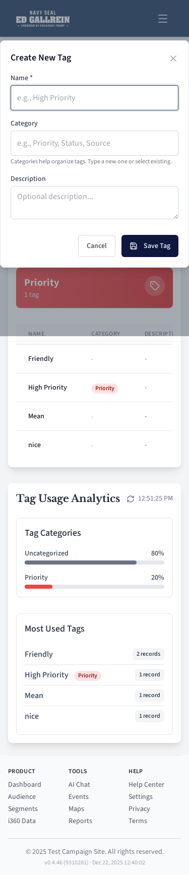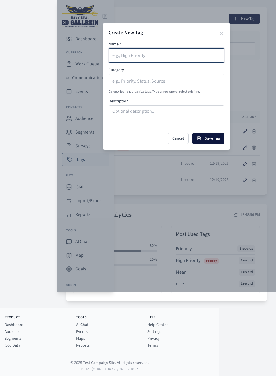 Tag creation modal.
